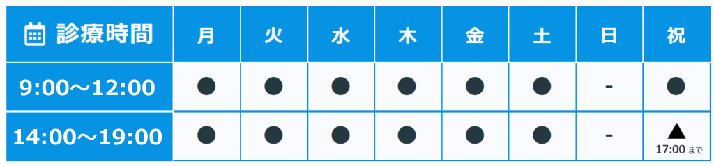 | 診療日 | 月~土・祝日 9:00~12:00、14:00~19:00 ※祝日17:00まで |
